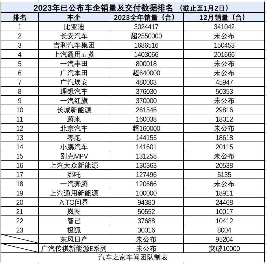 2024-01-03 10:01:142024年新年伊始,各大車企公布2023年銷量及交付數(shù)據(jù),我們也對(duì)目前已經(jīng)公布的全年銷量及交付數(shù)據(jù)進(jìn)行排名,截止至1月2日。比亞迪、長安、吉利三大汽車集團(tuán)位列2023年銷量排名前三。