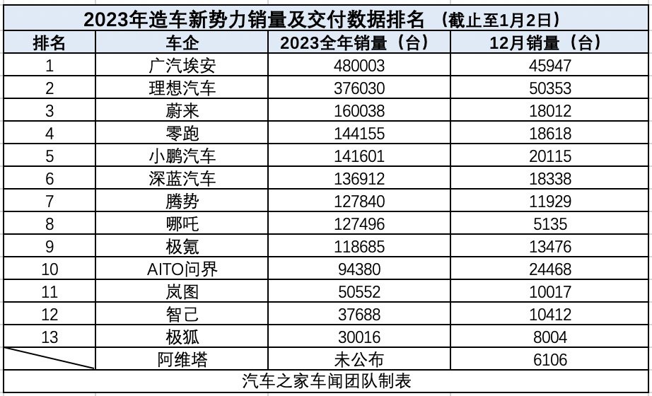 中國品牌新勢力方面,埃安和理想成為第一梯隊(duì)的成員,埃安2023年累計(jì)銷量48萬臺(tái),同比增長77%,理想全年累計(jì)交付超37萬臺(tái),同比增長182.2%。值得注意的是,理想12月銷量已經(jīng)突破5萬臺(tái),而到2024年,理想要沖擊全年銷量目標(biāo)是80萬輛,月銷量挑戰(zhàn)10萬輛,單車月銷量沖擊3萬輛。