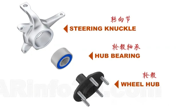 整個(gè)輪轂總成由輪轂、輪轂軸承、轉(zhuǎn)向節(jié)組成,三者相連接后,再通過(guò)轉(zhuǎn)向節(jié)與控制臂相連。