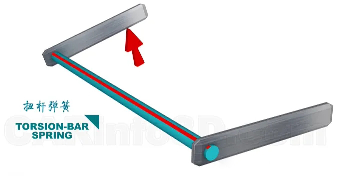 扭桿彈簧是一根可以扭轉(zhuǎn)的金屬棒,使用時(shí)一端固定在車架上,另外一端與控制臂相連,當(dāng)車輪經(jīng)過(guò)障礙物后,扭桿彈簧儲(chǔ)存的彈性勢(shì)能使控制臂和車輪迅速回位。