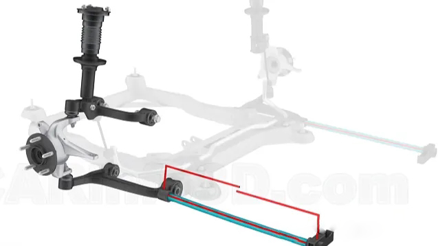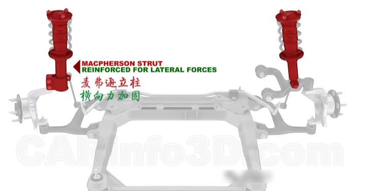 當(dāng)然在雙叉臂懸架中,減震器無(wú)需隨控制臂轉(zhuǎn)動(dòng),只承受縱向載荷,因此橫向剛度大,操控性強(qiáng)。