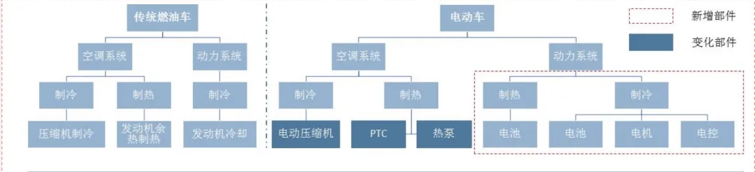 傳統(tǒng)汽車熱管理主要聚焦于發(fā)動(dòng)機(jī)和變速箱的冷卻,以及乘員艙的空調(diào)調(diào)節(jié)。而新能源汽車,隨著電機(jī)電控系統(tǒng)、高能量密度電池系統(tǒng)的引入,其熱管理變得更為復(fù)雜,涵蓋了電機(jī)電控系統(tǒng)、電池系統(tǒng)以及乘員艙空調(diào)的熱管理。