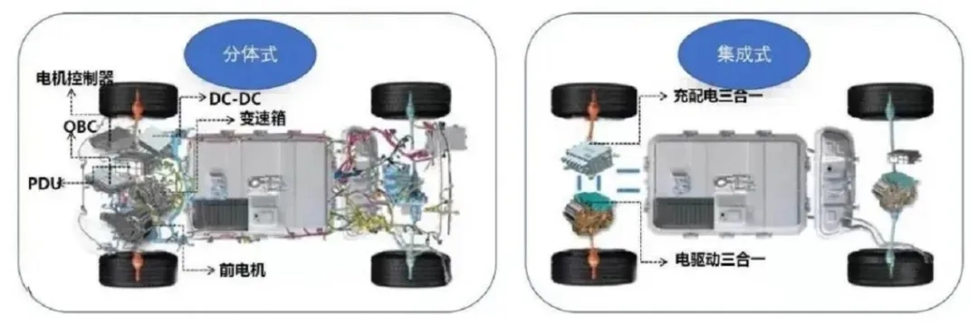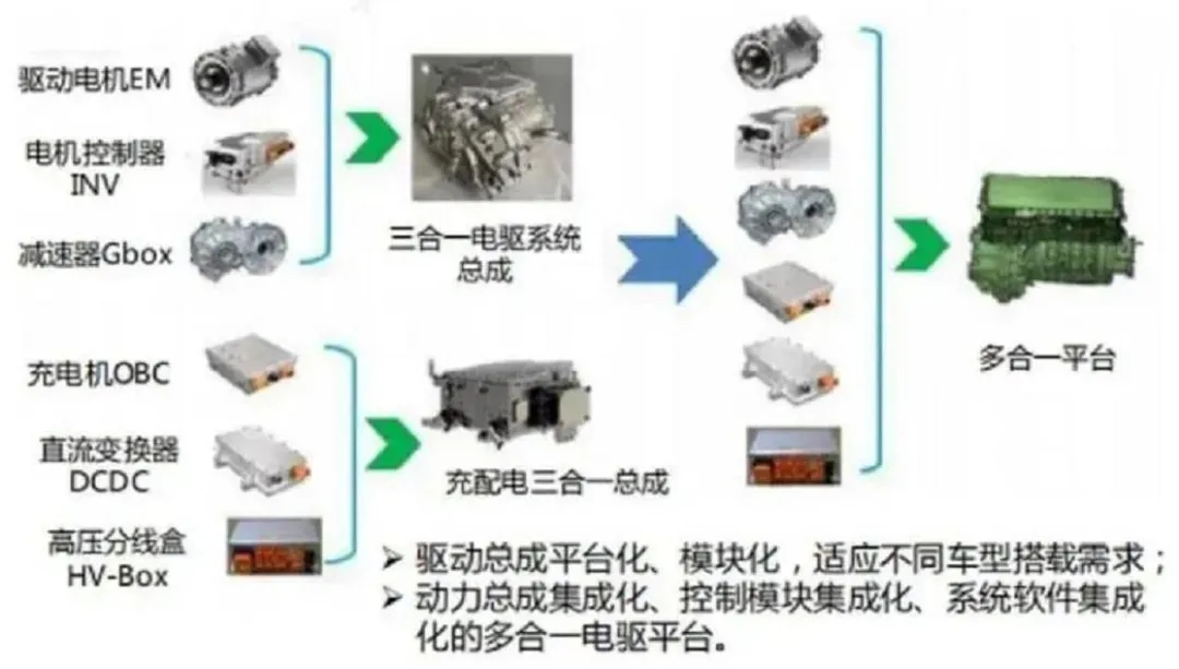 多合一將逐漸代替三合一:未來(lái),除電機(jī)、電機(jī)控制器、減速器外,高壓分線盒、DC/DC、充電機(jī)OBC等部件也可能集成進(jìn)動(dòng)力總成系統(tǒng),形成功能更全的多合一系統(tǒng)。