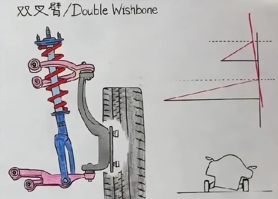 雙叉臂懸掛可以看作是麥弗遜懸掛的改良升級版。它將原本由麥弗遜下臂單獨承受的力分散到了兩根連桿上。其最大優(yōu)點在于,動態(tài)行駛中由于上臂短于下臂,能夠改變車輪的外傾角,從而顯著提升車輛的極限操控性能。不過,與麥弗遜懸掛相比,雙叉臂懸掛的成本更高,且占用空間更大。橡膠墊圈的作用
