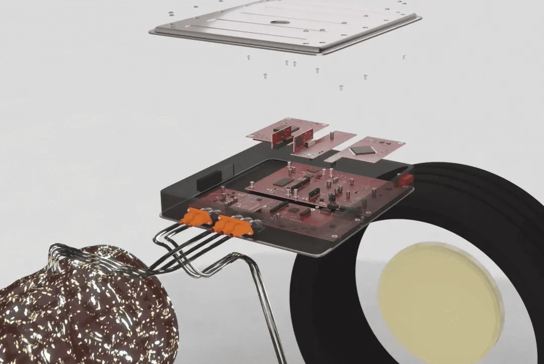 汽車(chē)逆變器中內(nèi)部單元的圖示示例,顯示了多個(gè)PCB配置中的各種組件連接