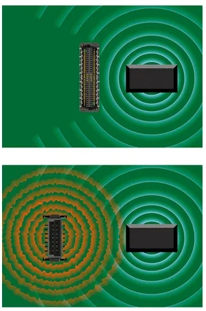 一個(gè)屏蔽連接器(上)和兩個(gè)非屏蔽連接器(下)的比較。屏蔽選項(xiàng)不僅可以防止來(lái)自附近連接器的干擾,還可以防止其自身的信號(hào)干擾周?chē)倪B接
