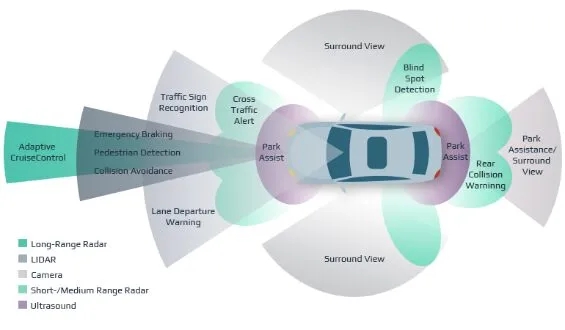 “視覺(jué)”數(shù)量示例,包括重疊的攝像頭、雷達(dá)、激光雷達(dá)和超聲波傳感器,這些傳感器必須在車(chē)輛系統(tǒng)內(nèi)緊密運(yùn)行,以傳輸信息和計(jì)算戰(zhàn)略反應(yīng)