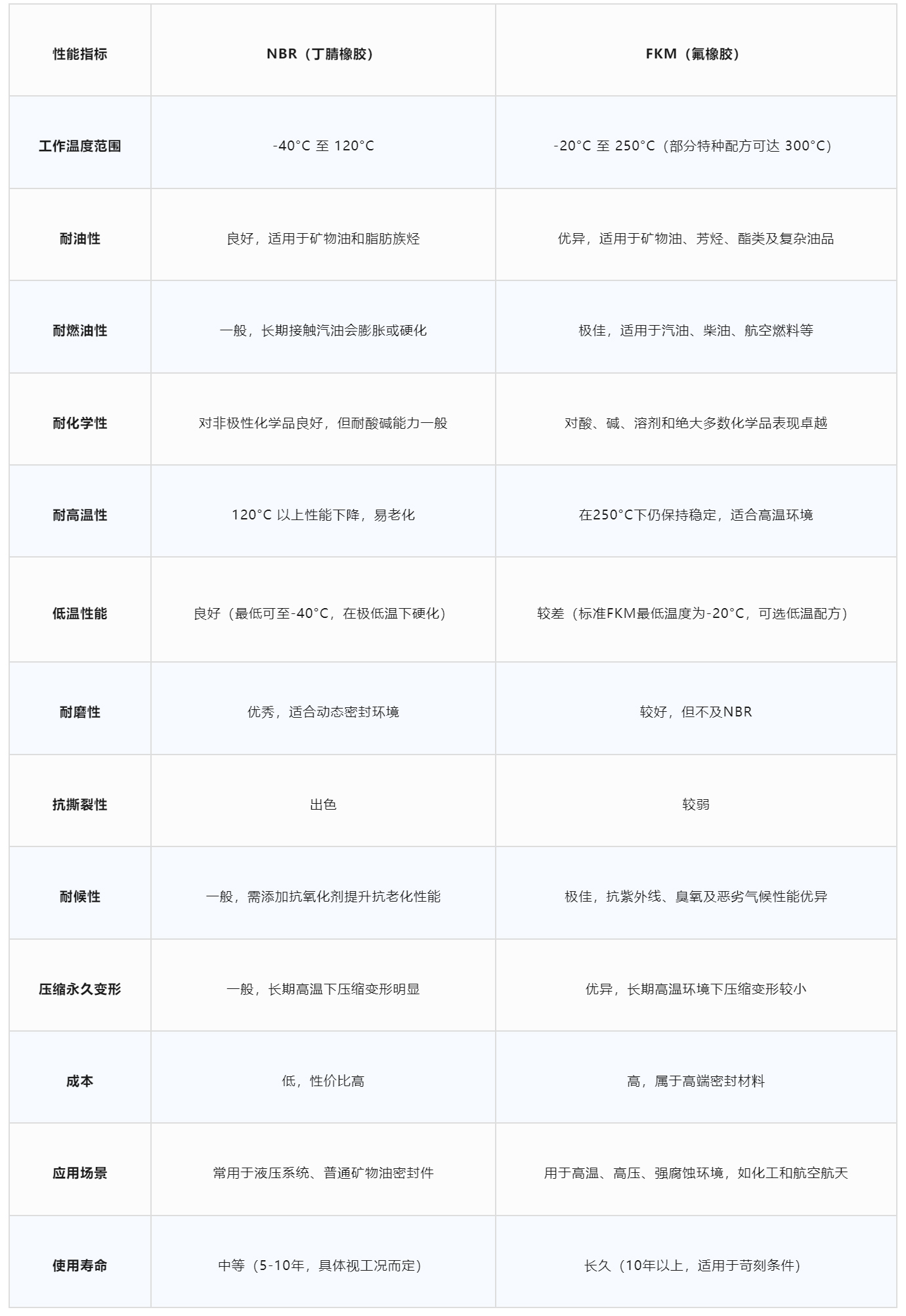 FKM:使用溫度范圍-20°C至250°C(部分可達(dá)300°C),高溫下保持柔韌性和密封性能。