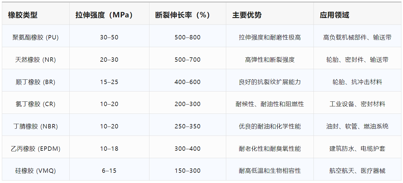 綜上所述,聚氨酯橡膠憑借其頂尖的拉伸強度和耐磨性在高性能橡膠中獨占鰲頭;天然橡膠則以其卓越的彈性和強度緊隨其后;而氯丁橡膠憑借均衡的拉伸強度、耐候性和阻燃性,在工程和工業(yè)領(lǐng)域占據(jù)重要地位。各類橡膠材料依據(jù)其獨特的性能特點,在各自的應(yīng)用場景中發(fā)揮著不可替代的作用。