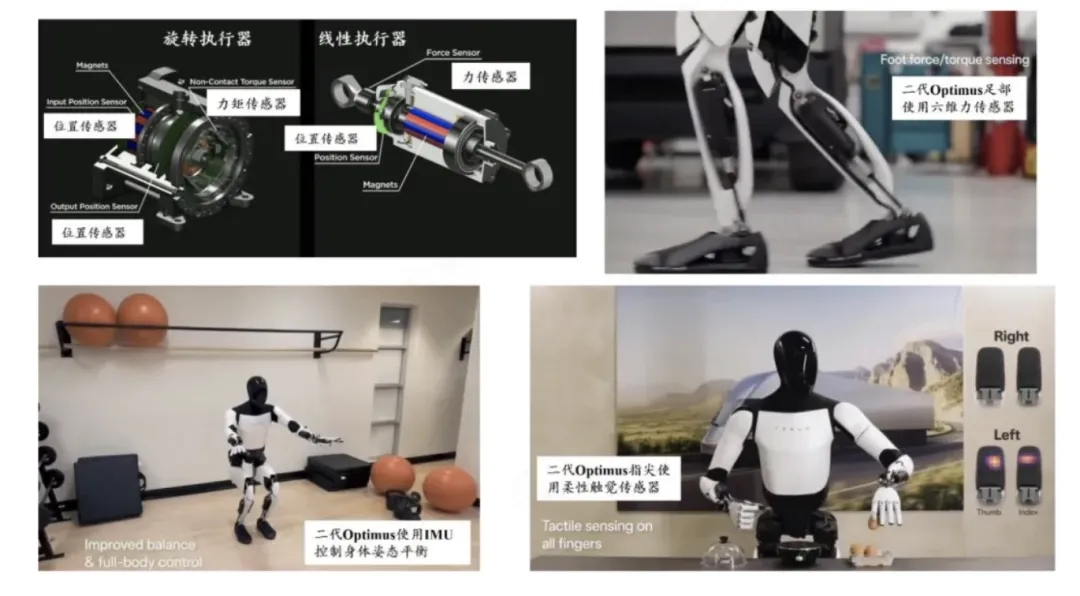 傳感器是人形機(jī)器人感知系統(tǒng)的重要元器件,主要有力/力矩傳感器、觸覺傳感器、視覺傳感器、編碼器、慣性傳感器等幾大方向。特斯拉人形機(jī)器人中使用的傳感器如下圖所示。
