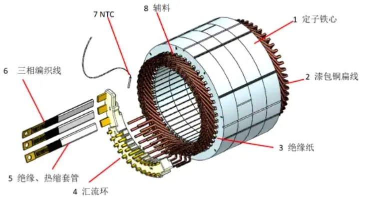 扁線電機:采用矩形截面的銅線繞組,提升槽滿率約30%,實現(xiàn)更高功率密度和效率,已廣泛應(yīng)用于比亞迪、大眾、特斯拉等品牌車型;