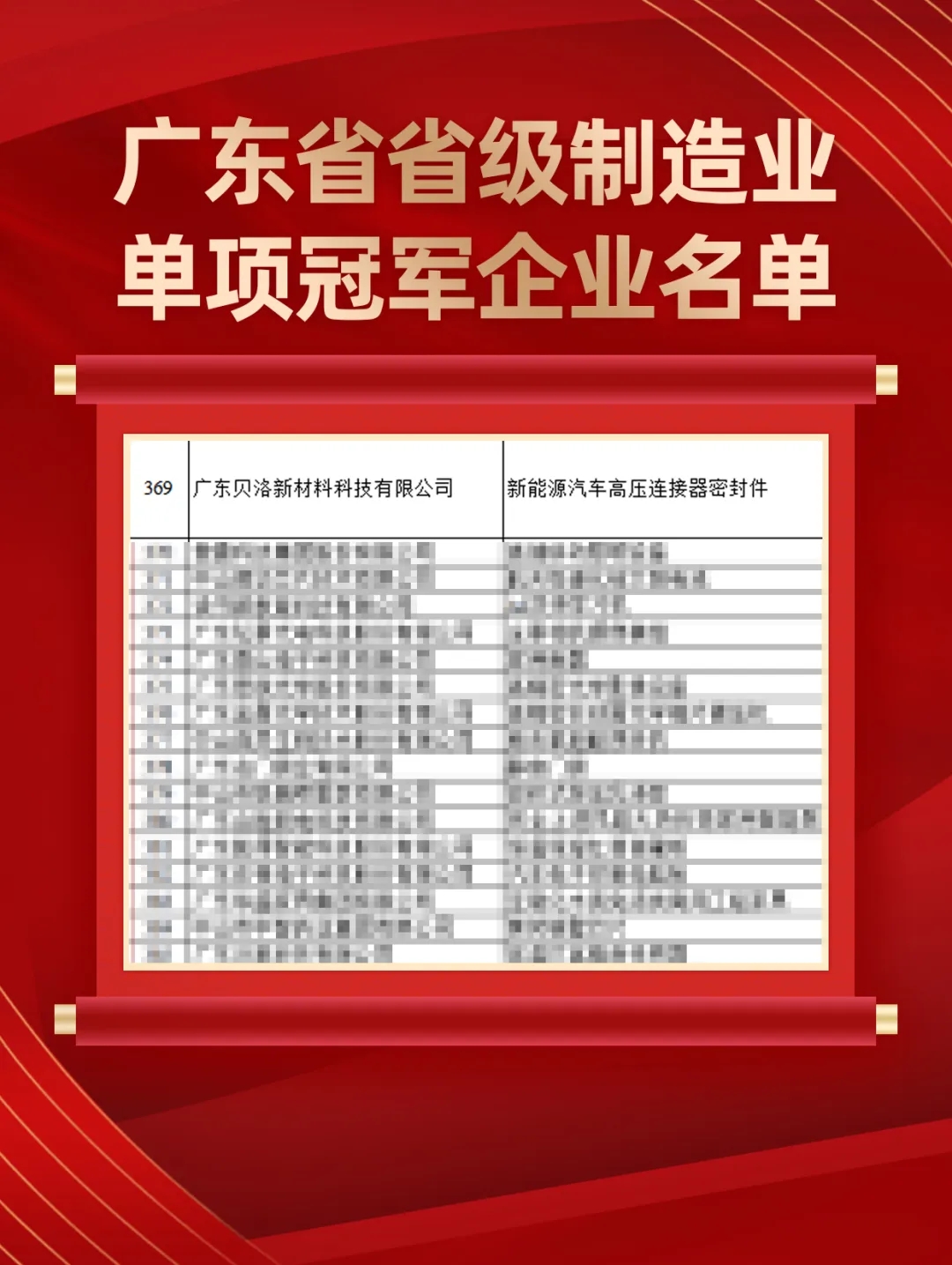 “廣東省制造業(yè)單項冠軍”是廣東省制造業(yè)領(lǐng)域的最高榮譽之一,認定標準極為嚴苛,貝洛以“新能源汽車高壓連接器密封件”作為主導(dǎo)產(chǎn)品獲此殊榮,是本次唯一一家高壓連接器密封件企業(yè),這是對高壓連接器市場與密封技術(shù)實力的最佳詮釋。