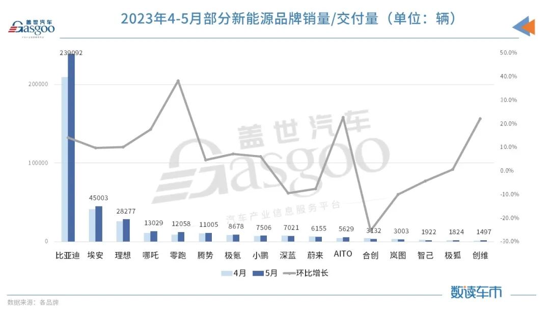 從車企銷量前十榜單來看,5月份的情況相對穩(wěn)定,比亞迪依然是市場影響力最大的品牌,也是唯一一個月銷量突破20萬輛的車企。在銷量前五名中,有四家是自主品牌。