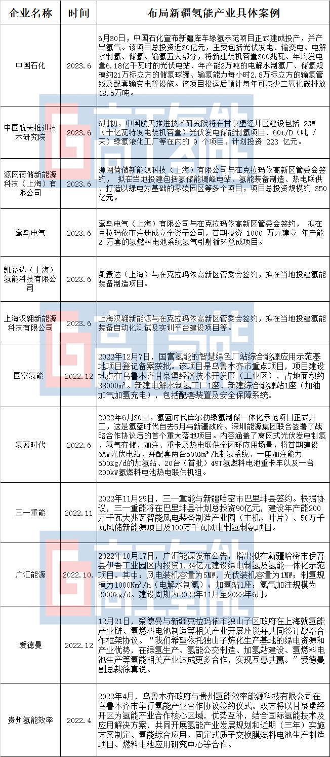 據(jù)不完全統(tǒng)計,國內(nèi)已有中石化、國富氫能、氫藍時代、三一重工、廣匯能源、愛德曼、中國航天推進技術研究院、源網(wǎng)荷儲新能源科技等多家公司在新疆展開氫能產(chǎn)業(yè)布局,具體布局情況如下: