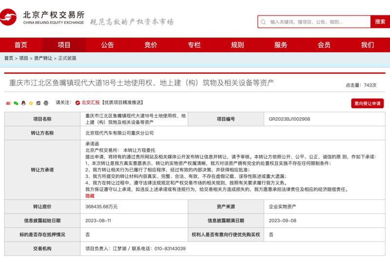 2023-08-24 14:08:59近日,一則名為“重慶市江北區(qū)魚嘴鎮(zhèn)現(xiàn)代大道18號土地使用權(quán)、地上建(構(gòu))筑物及相關(guān)設(shè)備等資產(chǎn)”的資產(chǎn)轉(zhuǎn)讓披露公告顯示,轉(zhuǎn)讓方為北京現(xiàn)代汽車有限公司重慶分公司,轉(zhuǎn)讓底價為36.84億元。要知道,當年該工廠的總投資為77.5億元,這意味著北京現(xiàn)代重慶工廠五折掛牌出售。